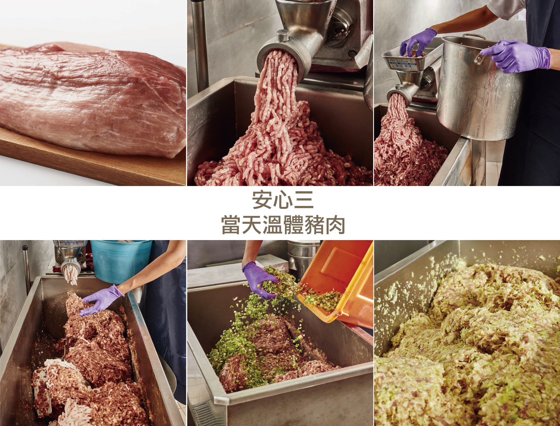 使用合格認證電宰廠當天現宰之溫體豬肉製作而成,從宰場至本廠運送過程全程低溫保鮮,製作過程完全不使用任何化學添加物,為要使每個客戶吃的安心、吃得新鮮、吃的健康、吃的放心。