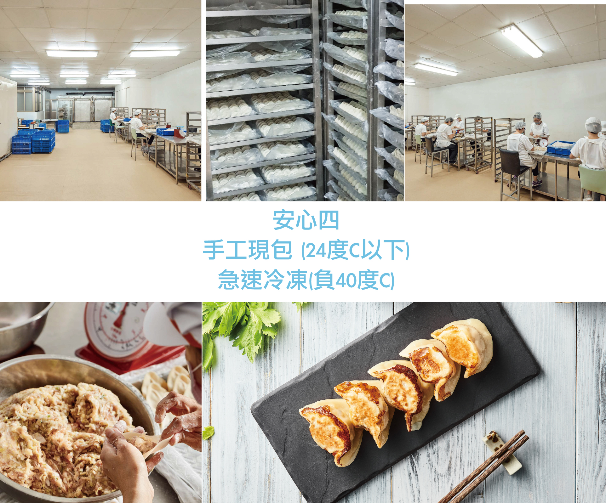 全程低溫手工製作,保持肉品與食材的新鮮,完成後便立即送入急速冷凍室,以確保水餃品質。讓每個顧客吃到的水餃如同剛製作完成一般新鮮美味。